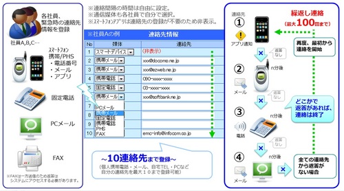 地震や災害の状況によって、どの端末が使えるかは判りません。だからこそ、考えられるすべての端末を登録して使えるもので連絡をすることが重要です。例えばスマホ1台持っていたとすると、メール、電話、スマホアプリと3つの連絡先を登録する事が出来ます。会社から1台、個人で1台持っているとそれだけで、6つの連絡先になります。家の固定電話で7つ目、会社の名刺に書いているメールで8つ目、FAXがあれば9つ目とすぐに10位の連絡先があります。これを全部登録しておき、どれかで連絡を取れるようにする事が確実な安否確認につながります。
