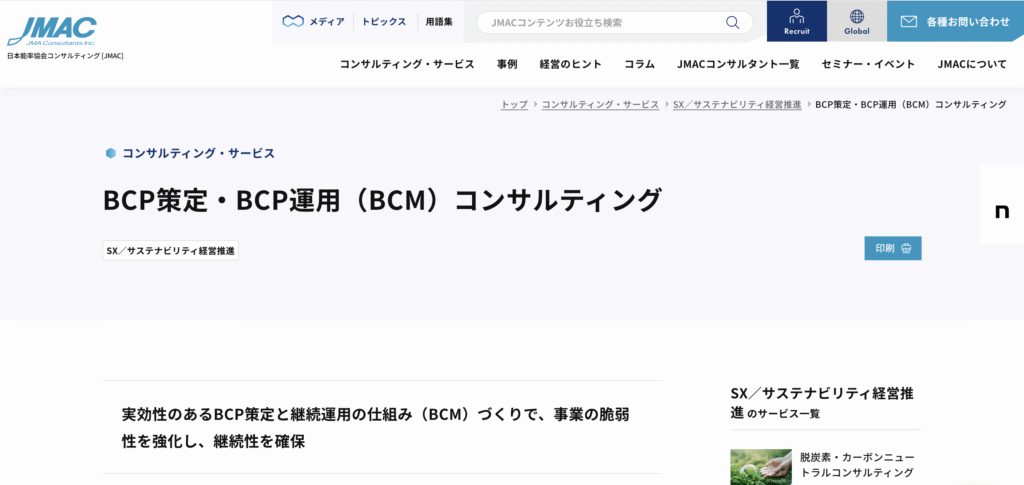 日本能率協会コンサルティング(JMAC)中堅自動車部品メーカーのBCP策定支援事例あり。リスク評価、BCP策定、BCM構築、BCP訓練・教育記載なし