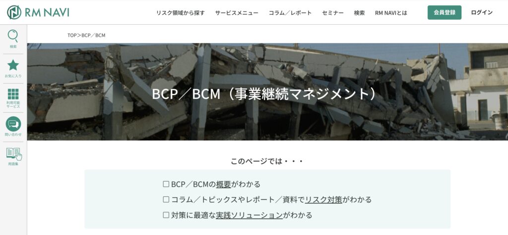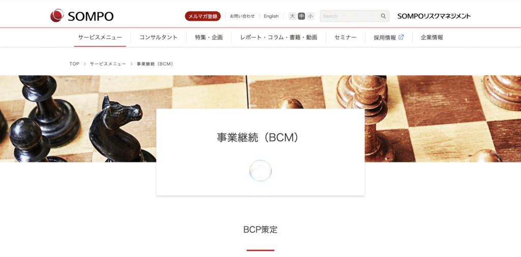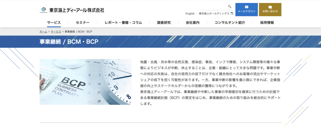 東京海上ディーアール様々な業界に精通したコンサルタントによる支援。BCP策定支援、BCM構築運用支援、訓練支援、地震被害想定調査記載なし