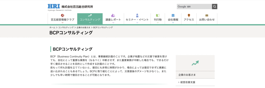 百五総合研究所中小企業向け実績豊富(精密機械、飲食、建設など10社)。三重県主催BCP研修講師実績あり。中小企業向けBCPコンサルティング具体的な料金は記載なし