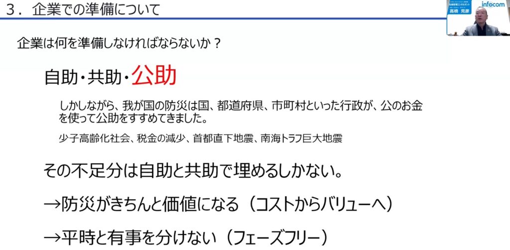 そういった点を踏まえ、企業が災害に備えていくために実施していかなければいけないことは共助の備えです。企業において、どんなことが起きようとその会社の重要事業は変わりません。災害が起きたとき、社員の人命を守るとともに重要事業を継続することが大切なことです。そのためにBCP(事業継続計画)を災害が起こる前にしっかり見直さなければなりません。