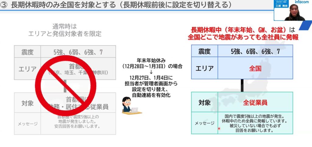 などの質問を地震発生後にいただき、質問をいただきました会社様と個別打ち合わせを実施しております。エマージェンシーコールではこういった状況に合わせて柔軟に設定を組むことが可能です。もしわからないことや不安に思うことありましたら、遠慮なく相談していただきたいです。