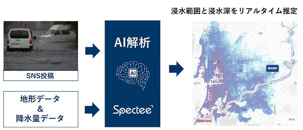 Specteeは、「危機を可視化する」をミッションに、SNSや気象データ、カーナビ情報や道路カメラなどのデータから災害・リスク情報を解析し、被害状況の可視化や予測を行っている防災テックベンチャーの企業です。