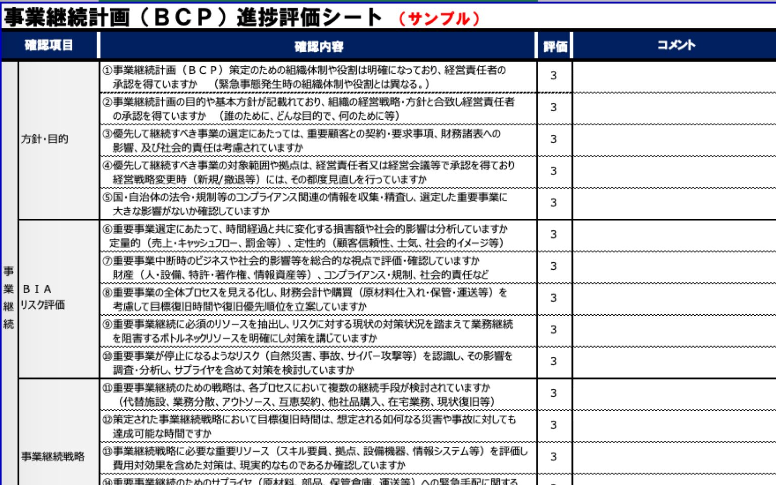【無料ダウンロード】BCM進捗評価サンプルシート